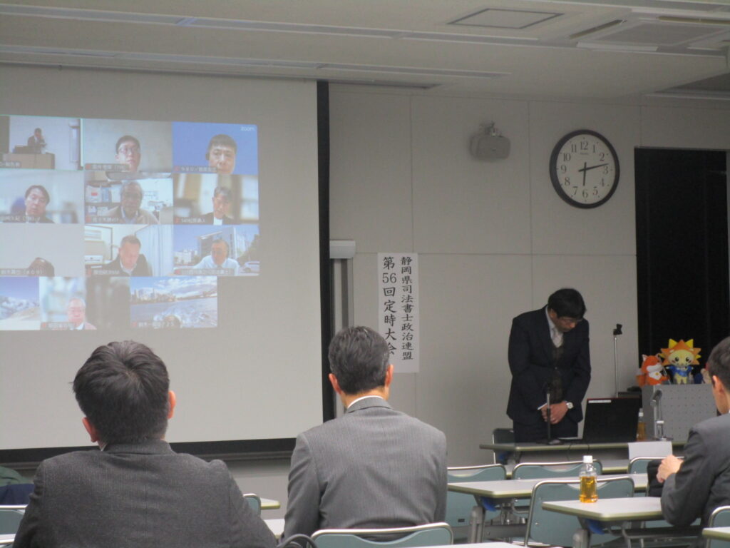 令和7年2月27日、静岡県司法書士会館4階司ホールにおいて、『静岡県司法書士政治連盟第56回定時大会』が開催されました。以下、その報告です。